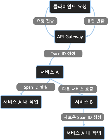 | Span ID | 요청 처리 중 하나의 작업 단위를 식별하는 ID (서비스 호출, DB 쿼리 등) |