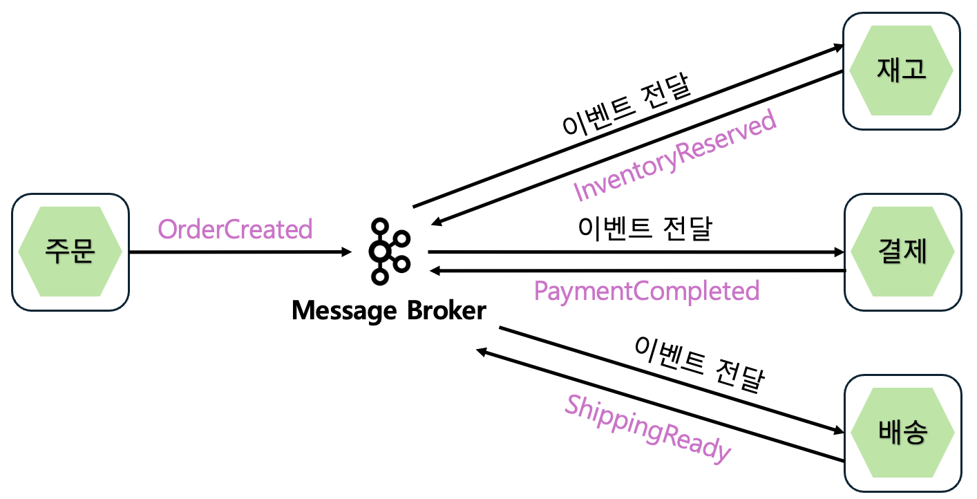 주문 -> 재고 -> 결제 -> 배송처럼 독립된 서비스들이 순차적으로 연결되며 전체 프로세스가 완성된다.