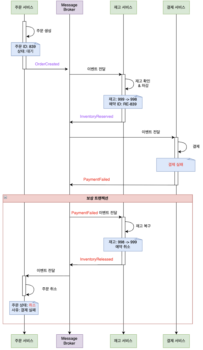 아래 시퀀스 다이어그램은 “결제 실패(PaymentFailed)” 상황에서 각 서비스가 어떻게 보상 트랜잭션을 수행하는지를 보여준다.