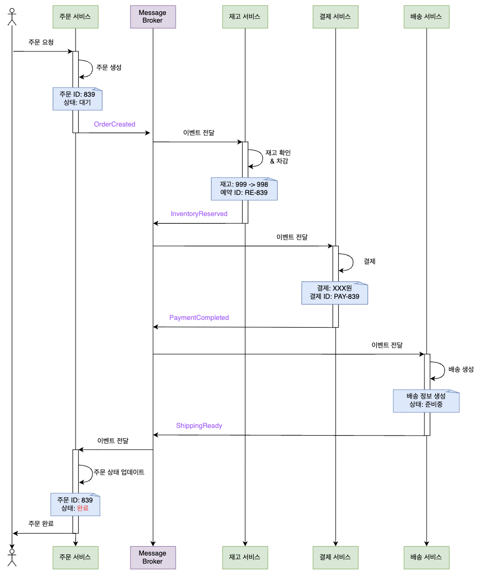 아래 시퀀스 다이어그램은 Choreography 방식이 실제로 어떻게 동작하는지 잘 보여준다.