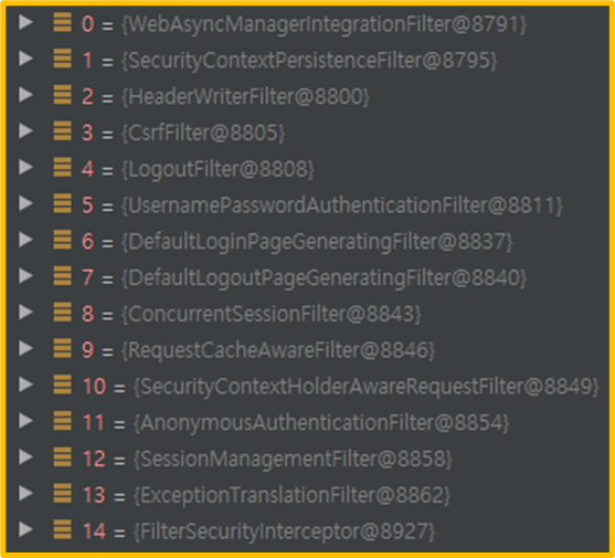 - 스프링 시큐리티 초기화 시 생성되는 필터들을 관리하고 제어